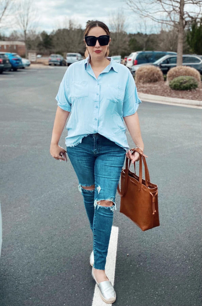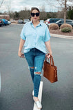 features short sleeves, button-down with front pockets, collar, roll-up sleeves, and fringed hem detail. Relaxed fit