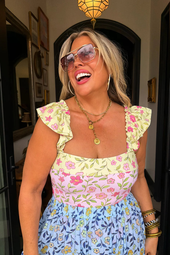 TOP:  Perfect stomach coverage and comfort, this completely smocked top features a padded lined bra, removable straps, and the cutest ruffle trim!