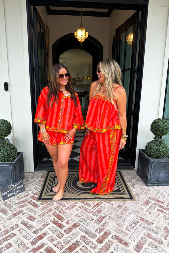 Bring bold, breezy vibes to your wardrobe with these colorful striped wide-leg pants! Designed with a relaxed fit and playful citrus-inspired trim, these lightweight pants are perfect for resort days, lounging, or casual outings.