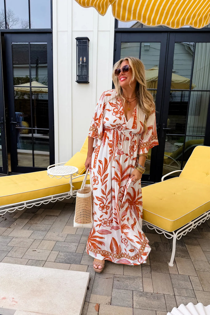 Featuring a beautiful rust-orange tropical print on a crisp white background, this flowy dress offers effortless elegance for any sunny occasion. The deep V-neckline, wide flutter sleeves, a tie waist with elastic band creates a flattering silhouette that moves with you.